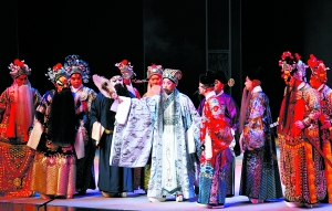 《赤壁》改編自真實的歷史戰(zhàn)爭,孫劉聯(lián)盟抗曹的智慧使其成為經(jīng)典的戰(zhàn)爭案例。但編劇并沒有止步于對戰(zhàn)爭的簡單描述,劇終時,諸葛亮的“把酒祭江”為全劇畫上點睛之筆。炙烈通紅的赤壁磯上,一襲白衣的諸葛亮,沒有和眾人一起痛飲慶功酒,卻酹酒三杯“祭江”,唱出了“兵者,兇器也,圣人不得已而用之”的感嘆,唱出了對和平的渴求。這一段20多句的大段反二黃,豪邁、蒼涼更不乏悲壯,堪稱全劇最精彩的唱段之一。