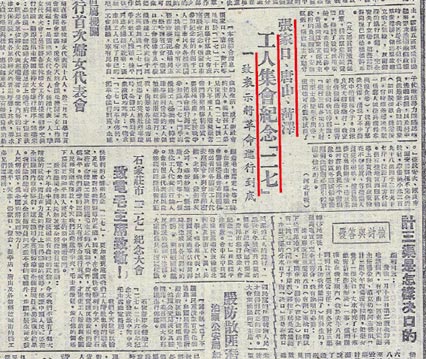 7.1949年2月17日《人民日?qǐng)?bào)》第2版刊登的報(bào)道:張家口、唐山、菏澤工人集會(huì),紀(jì)念“二七”,一致表示將革命進(jìn)行到底