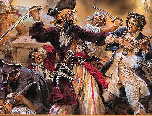 作為加勒比海盜的領(lǐng)軍人物之一,黑胡子見(jiàn)證了加勒比海盜的興起。黑胡子原名愛(ài)德華 蒂奇,1680年出生于英國(guó),十幾歲時(shí)他便登上一條英國(guó)海盜船當(dāng)了一個(gè)小海盜,這條海盜船擁有英國(guó)政府頒發(fā)的私掠許可證,因此可以在英國(guó)政府庇護(hù)下攻擊和掠奪敵對(duì)國(guó)家的商船。成年后,愛(ài)德華留起了一臉濃密的黑胡子,有時(shí)還會(huì)編成小辮,由此他獲得了黑胡子的綽號(hào)。據(jù)說(shuō),他力大如牛、酒量過(guò)人,可以在一整天海戰(zhàn)后,豪飲一夜朗姆酒,然后精神百倍地再次投入廝殺;因?yàn)橄恿倚缘睦誓肪撇粔騽,他還常常要在酒里灑上一把火藥。