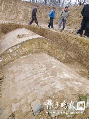 昨天下午,記者來(lái)到位于雨花臺(tái)區(qū)鐵心橋附近一個(gè)叫馬家店的村落,這里正在進(jìn)行京滬高鐵的勘探施工。幾名工人告訴記者,他們負(fù)責(zé)在此日夜看護(hù)古墓,“因?yàn)楣拍贡话l(fā)現(xiàn)時(shí),墓門已經(jīng)被聞風(fēng)而來(lái)的盜墓賊破壞了,東面的一座古墓發(fā)現(xiàn)有人進(jìn)去過(guò)的痕跡。”記者爬上西面的一座古墓,只見考古人員已經(jīng)挖出古墓的地表范圍,大部分墓頂已經(jīng)露出土層。考古人員說(shuō),這座古墓比較大,外形保存基本完好,長(zhǎng)約有8米,寬約3.5米,近幾日就準(zhǔn)備打開墓門。”記者看見墓室的圈頂上有一堆看似被動(dòng)過(guò)的亂磚,大約80厘米見方,考古人員介紹說(shuō),應(yīng)當(dāng)是過(guò)去盜墓賊留下的“杰作”。