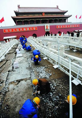 為迎接新中國成立60周年,天安門金水橋從昨日起開始修繕。天安門管委會昨日消息稱,此項工程預計在5月1日前完工。來自北京市文物局官網的招標公告顯示,工程財政撥款資金94.64萬元。