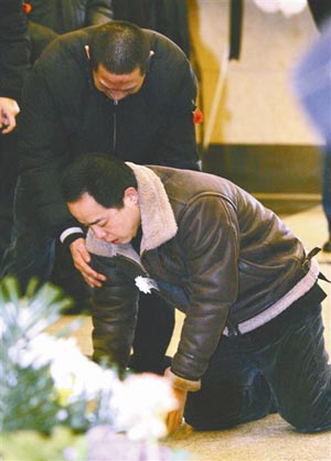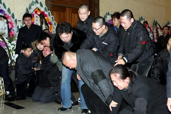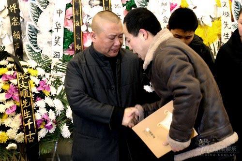 上午7點(diǎn)44分,德云社內(nèi)部的吊唁活動(dòng)率先進(jìn)行。郭德綱、王惠夫婦,于謙、王海、李菁、何云偉、曹云金等骨干演員率百名演職人員向張文順先生的遺體默哀,禮畢后人人號(hào)啕大哭,痛不欲生。雙眼紅腫、哽咽不斷的郭德綱嘆息說,張先生走得太早了,自己失去了一位摯友,他愿老人能夠在天享福,歡笑來生。郭德綱承諾會(huì)照顧張夫人,并用心培養(yǎng)張文順的外孫寧云祥在德云社說好相聲。
