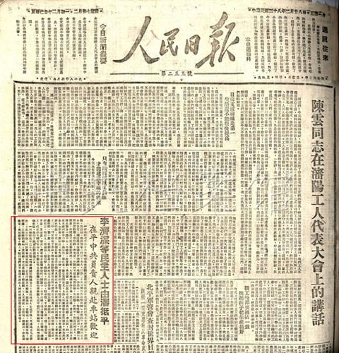4.1949年2月28日,《人民日報》關(guān)于李濟(jì)深等民主人士由沈陽抵達(dá)北平的報道