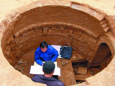 記者看到,在一個方坑內,有一座青磚壘砌的精美古墓已經(jīng)顯露出來。只見這個古墓有墓道、墓門和墓室。墓門呈拱形,高約1.6米,造型非常精致。墓室是圓形,頂部呈穹頂,高約2米,直徑約2米,北側有一盜洞痕跡。墓室底部由青磚鋪地,很像是一個炕。