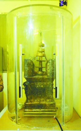 本月28日,“長干寺地宮出土文物展”將在南京市博物館盛大開幕,被譽(yù)為“驚世大發(fā)現(xiàn)”的阿育王塔(如圖,崔曉攝)也將首次公開亮相。除了“塔王”,市民在這次展覽中或許還會(huì)收獲意外的驚喜。記者昨日獲悉,南京市博物館的考古專家近期可能會(huì)從阿育王塔中請(qǐng)出金棺銀槨。不出意外,這件裝有佛頂真骨、諸圣舍利、感應(yīng)舍利的“圣物”,也將和長干寺地宮出土的其他文物一起出現(xiàn)在展覽現(xiàn)場(chǎng)。
