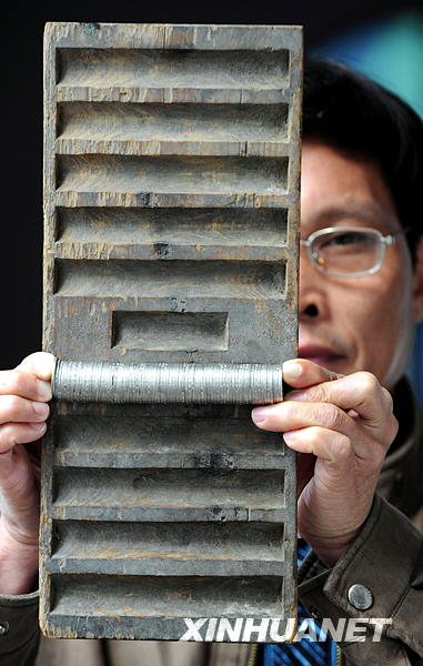 據(jù)介紹,這塊清代使用的“點鈔機”狀似算盤,長37厘米,寬16厘米,內刻有11條凹槽,直徑同當時流通的銅幣直徑吻合,其中10條長凹槽可一次性勘驗1000枚銅幣,中部的一條短凹槽可勘驗50枚銅幣。新華社記者彭張青攝