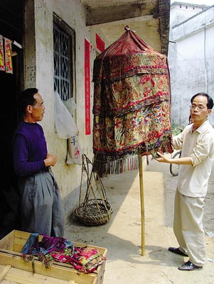 采訪中,李初愛(ài)老伯常提起祖先留傳下來(lái)的官傘,原來(lái),這傘是冷坑李氏一族的“傳家寶”。李初愛(ài)小心翼翼地從房間里的一口木箱中取出折疊好的兩頂官傘,記者見(jiàn)到,木箱底中墊放有鞭炮!斑@可以驅(qū)蟲(chóng)防潮,”李初愛(ài)解釋說(shuō),“村中遇有大喜事,才啟用這兩頂官傘!