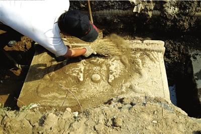 經(jīng)過(guò)村民們連續(xù)幾天的挖掘,昨天,昌平區(qū)舊縣村發(fā)現(xiàn)的石碑終于露出了“真容”,石碑分為寫(xiě)有碑文的碑身和印有二龍戲珠圖案的碑座,碑文顯示該石碑為重建寺的碑記。昌平區(qū)文委和昌平文物所工作人員說(shuō),該碑的價(jià)值有待進(jìn)一步研究。