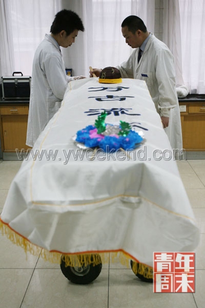 這是年輕的整容師一天中最普通的一單工作,只用時10分鐘。一天最少完成20具。對于張洋來說,早已習慣了這份工作!盎蛘哒f,我必須學會麻木!睆堁蟾嬖V記者。
