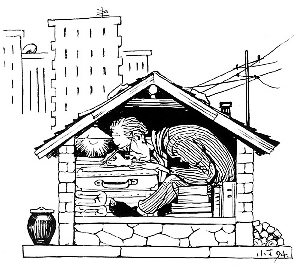 陳四益回憶中,丁老有著老一輩知識分子的風(fēng)骨,他說:“他的生活一直很艱苦,但是他從來不挑挑揀揀!碑(dāng)年,丁老師給巴金等作家的書配插畫時,正在美術(shù)館做給畫貼標(biāo)簽的工作,他就是在那些標(biāo)簽紙上畫書的插圖的。丁老師的住房條件一直十分艱苦,房子很小,最后屋子里東西堆到放不下,他就只好自己去租了一間老房子搞創(chuàng)作。(如圖丁聰漫畫《書中沒有黃金屋》)
