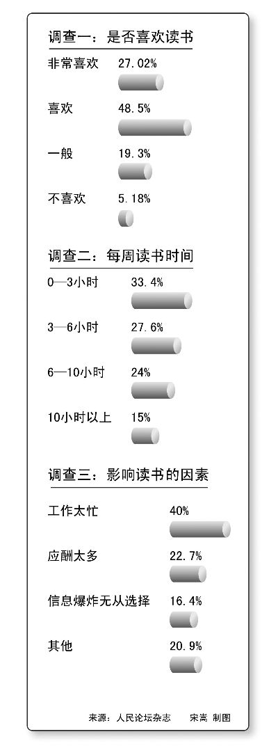 為了解干部讀書現(xiàn)狀,人民論壇雜志社近日在全國范圍內(nèi)組織了“萬名黨政干部閱讀狀況調(diào)查”。結(jié)果顯示,七成多的黨政干部讀書的愿望強(qiáng)烈,但由于工作忙、應(yīng)酬多等原因,33.4%的受訪干部每周的讀書時間為0—3小時,27.6%為3—6小時。
