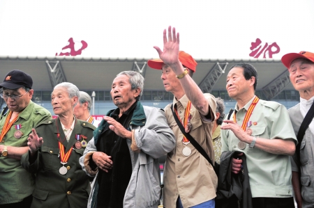 16時許,這批年齡都在80余歲左右的“四川老兵”陸續(xù)來到了報社門口集合。大家的表情顯得有些興奮,雖然是臨時接到接機的通知,老人們還是精心準備了一番,每個人都戴上了建川博物館送給他們的紀念抗日戰(zhàn)爭勝利60周年徽章,82歲的王世雨老人的左胸上,更是戴滿了記錄著他崢嶸軍旅生涯的各式獎?wù)隆?/p>