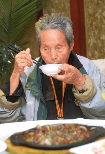 回鍋肉、麻婆豆腐,老人看著桌上地道的川菜有點發(fā)呆,低頭,聞聞。“外公,吃塊回鍋肉!背陨霞亦l(xiāng)的肉,老人一定覺得那肉香似曾相識!皝,我們歡迎老兵回家。”飯桌上,大家共同舉杯祝福,歡迎老人回家。