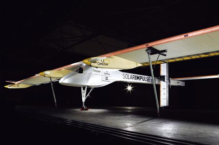 6 月26 日,伯特蘭·皮卡特在瑞士的蘇黎世機(jī)場(chǎng),向人們展示了這架依靠太陽(yáng)能作為全部動(dòng)力的飛機(jī)。這架飛機(jī)看上過(guò)去纖巧、修長(zhǎng),機(jī)翼和尾翼上都蒙覆了一層薄膜一般的太陽(yáng)能電池板。這些電池板將把陽(yáng)光轉(zhuǎn)化為電能,不僅能讓飛機(jī)在白天持續(xù)飛行,在夜間,被電池板儲(chǔ)存下來(lái)的能量也能支持飛機(jī)繼續(xù)它的行程。