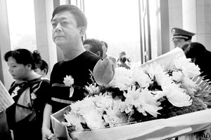 朱軍手捧的花束由菊花和季羨林生前最喜歡的荷花組成。記者注意到,在來(lái)賓簽名冊(cè)上,他簽下的名字是朱一軍。