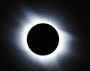 一旦太陽(yáng)被完全遮住,你可以看到日冕的整個(gè)光環(huán),它的亮度和滿月差不多。通常,因?yàn)樗{(lán)色的太空你看不到它。