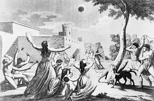 一天,兩軍對陣,激烈的廝殺一直持續(xù)到太陽偏西。忽然,士兵們發(fā)現(xiàn),一個(gè)黑影闖入圓圓的日面,把太陽一點(diǎn)點(diǎn)吞食,眩目的太陽光盤逐漸減少,大地的亮度慢慢減弱,好像黃昏提前來到。隨即,太陽全被吞沒,頓時(shí)天昏地暗,仿佛夜幕突然降臨,一些亮星在昏暗的天空中閃爍。士兵們從來沒見過這種景象,驚得目瞪口呆,停止了廝殺。