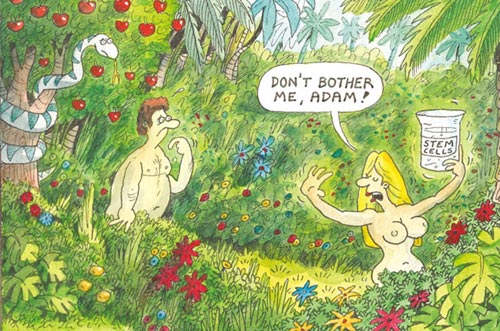 7月9 日,英國《太陽報》登出一張漫畫,在漫畫中,置身于伊甸園中的夏娃手持一只貼著“干細(xì)胞”標(biāo)簽的燒杯,一臉傲慢地說:“亞當(dāng),請別煩我!”對事件的中心人物納伊尼亞教授而言,倫理上的質(zhì)疑和爭議似乎并沒有給他帶來什么困擾。他認(rèn)為此項研究可以為那些想要孩子卻沒有能力的家庭帶去福音,而爭議則“完全可以通過法律最后進(jìn)行規(guī)約”。面對紛至沓來的媒體,納伊尼亞教授仍沉浸在實驗成功所帶來的興奮之中:“這太令人興奮了!這些人造的精子有頭,有尾巴,也可以移動,它們具備能夠產(chǎn)生生命的一切特質(zhì)!”