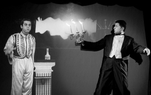 他的魔術(shù),每次都能迷惑所有人,因?yàn)闊o論怎樣,這都像兩個人“打配合”的表演:希臘魔術(shù)師、國際魔術(shù)界公認(rèn)最好的電影魔術(shù)大師喬哥斯,在幕布做成的鏡子前,捧出一個小瓶子。裊裊煙霧中,一個古裝魔術(shù)師從瓶中鉆出,如阿拉丁神燈的傳奇。一古一今兩個魔術(shù)師,能在鏡子內(nèi)外拿球互擲“打架”,能忽地變出槍射擊。更不可思議的是,鏡中的古代魔術(shù)師還能走出鏡外,成為一個有血有肉的人,原來的人,則變成“影子”。