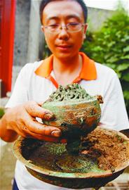 就在記者將要發(fā)稿時,考古工地又傳來消息,在8月9日最新發(fā)掘的一座漢墓中,出土了幾件重量級文物:1件銅薰爐、1件鐵鼎和5個陶罐,另外在腐爛的棺木下面 還發(fā)現(xiàn)鋪有一層漢代五銖錢,其中最為珍貴的是銅薰爐。銅薰爐分為上下兩部分,上為薰爐,鏤空,有花紋;下為一圓形銅盤,直徑大約有30厘米,薰爐與銅盤可 以對插,連接后成為完整的銅薰爐,高度約為20厘米。
