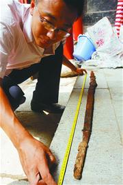 這次出土的幾件鐵器也引起了李銘的興趣。他告訴記者,別小看了這些鐵器,在漢代,這樣的鐵器屬于高檔品,不是一般人能用 的,更不是一般人能享受這樣的陪葬品的。這次出土的鐵器最重要的有3件。第一件是一柄鐵劍,已經(jīng)斷裂為5截,經(jīng)拼接后測量,其長大約1.15米。雖然劍體 銹蝕嚴重,但依然能看出質(zhì)地優(yōu)良,制作講究。劍柄的造型還基本清晰,劍箍為青銅制作。從這柄劍上,我們可以推斷很多當時的情況,如劍長1.15米,比現(xiàn)在 一般的劍要長,這就說明使用這柄劍的人身材比較高大;根據(jù)劍的形制,可初步認定是濟南當?shù)刂谱鳎绻ㄟ^科技手段研究出劍的鐵質(zhì)及其他合金含量,這對研究 漢代時期濟南地區(qū)的冶煉史有重要的參考價值。再說鐵鼎和鐵釜,它們都是漢代時期的生活用具。其中,鐵鼎為雙耳三足折腹鼎,形狀很好。雖然現(xiàn)在看銹蝕嚴重, 但在當時不是一般人家能夠使用的,不是官員,至少也是大戶人家,所以這對研究當時的社會生活和陪葬習俗都有重要價值。