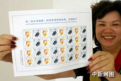 中新江蘇網鹽城8月17日電 (于從文 徐德鈺 李根) 上海吳女士16日來到江蘇鹽城,展示了以罕見的徐悲鴻畫豬圖為主題的個性化郵票設計效果圖。該連體郵票畫面中,一只火紅的剪紙鳳凰和一只黝黑的國畫豬相映成趣,給人以獨特的視覺感受。目前,這套郵票已經交付印刷,將在本月底發(fā)行。
