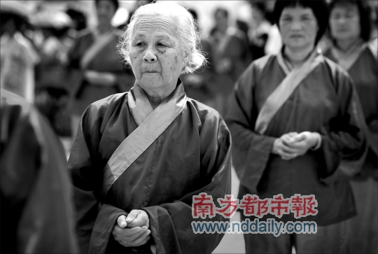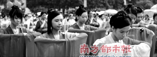 “每走一步、袖子怎么擺動,都有講究!睆V東省民俗文化研究會副秘書長、珠村民俗專家潘劍明是儀式主持,他透露,此次演出專門請來“漢禮”專家按歷史傳統(tǒng)還原場面。