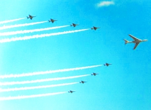 1954年國(guó)慶5周年閱兵時(shí),受閱的武器裝備由繳獲的“萬國(guó)牌”換成了型號(hào)、口徑統(tǒng)一的引進(jìn)或仿制的蘇式武器,武器裝備的機(jī)械化程度有了較大提高。1957年國(guó)慶閱兵,我國(guó)自行生產(chǎn)的伊爾-28型噴氣式轟炸機(jī)、殲5型殲擊機(jī)參加受閱,毛澤東主席在天安門城樓上高興地對(duì)外國(guó)朋友說:“我們自己的飛機(jī)飛過去了!”