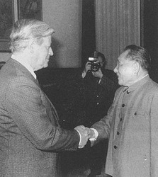 施密特:不能這么說(shuō)。這一次我可算直接弄明白了,等級(jí)制在中國(guó)是如何起作用的。在同鄧小平談話(huà)的時(shí)候,我感受到了年邁的毛澤東仍然具有非同尋常的權(quán)力。按當(dāng)時(shí)中國(guó)的做法,鄧向我們說(shuō)些什么,都要立刻匯報(bào)到毛那里去。不過(guò),在西方民主國(guó)家,部長(zhǎng)們同外賓的談話(huà)也要向外長(zhǎng)甚至政府首腦本人報(bào)告,也同樣是不言而喻的事。我們西方人對(duì)外賓表態(tài)也會(huì)因此而小心翼翼。和鄧小平的那兩次會(huì)談,中國(guó)外長(zhǎng)甚至就在座。當(dāng)時(shí)鄧很可能已經(jīng)知道,自己已經(jīng)上了要被打倒的名單。短短幾個(gè)月后,他果然再一次從政治舞臺(tái)上消失了。