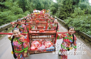 “人逢喜事精神爽,不知不覺就走攏了;恭喜主人,花轎來到你家門;你姑娘打扮好沒有?迎親隊(duì)伍都到了喲……”媒婆打招呼,成了新娘出閣特定的開場白。與女方對答完后,媒婆一聲“把禮盒抬進(jìn)去”,男方迎親隊(duì)伍中的總管即出列呈上禮單。之后,新娘“忙”起了上花轎前的出閣儀式:踩斗、丟筷子、罵媒、父親壓轎、哥哥背上轎、哭嫁。