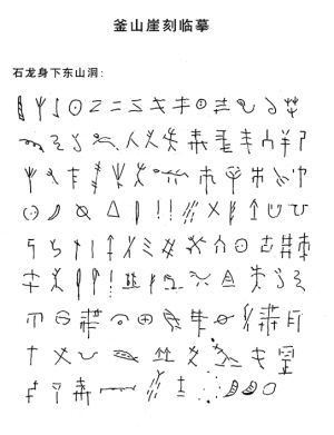 此外,釜山的崖洞內(nèi)還留有109個(gè)“古文字”。經(jīng)專家推測,這些“古文字”均為上古黃帝時(shí)代人類留下的符號,但其用意和內(nèi)容目前仍然無法破譯?脊湃藛T在研究對比中發(fā)現(xiàn),釜山崖刻和史前出土的刻畫符號有相同的,與早期青銅器上的刻畫符號也有相同的。這說明釜山的摩崖石刻不僅繼承了仰韶時(shí)期的特點(diǎn),同時(shí)又發(fā)展到了青銅器時(shí)代。這些刻畫符號的上限是公元前5000多年,下限是先商時(shí)期,大致相當(dāng)于黃帝“合符”的年代。