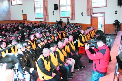 8時(shí)30分,庭審正式開始。宣布完法庭紀(jì)律后,審判長(zhǎng)一聲令下:“傳被告人到庭!”緊接著,27名身著橘色背心的被告人被帶上法庭。被告人在魚貫而入時(shí),均不時(shí)向旁聽席上張望,而旁聽席上也傳來一陣細(xì)細(xì)的抽泣聲。