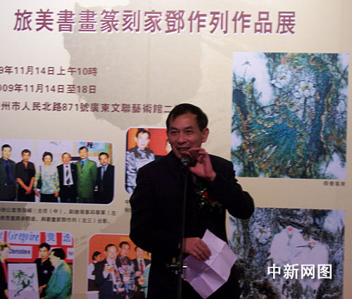 中新網(wǎng)廣州11月14日電(記者 莫非 通訊員 葉藍(lán))旅居美國(guó)西雅圖著名書畫篆刻家鄧作列書畫藝術(shù)作品展,于2009年11月14日至18日在廣東文聯(lián)藝術(shù)館舉行,當(dāng)?shù)貎S界與藝術(shù)界負(fù)責(zé)人和書畫藝術(shù)家、各界友好人士逾百人參加開幕典禮。