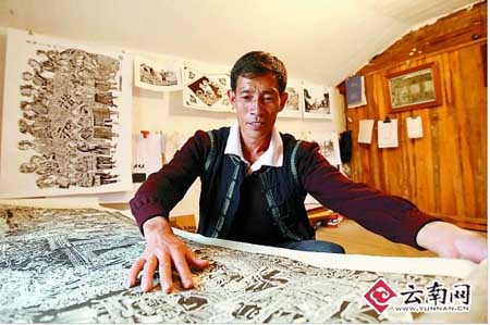 11月13日,記者前往采訪時(shí),農(nóng)民版畫家盧正林在自己的版畫工作室翻閱資料,為構(gòu)思新作做著準(zhǔn)備!皼]有想到,我們壯族農(nóng)民創(chuàng)作的20幅版畫能被外交部選定為國(guó)禮,胡錦濤主席出訪時(shí)以個(gè)人名義贈(zèng)予意大利國(guó)家領(lǐng)導(dǎo)人。”盧正林一臉興奮。