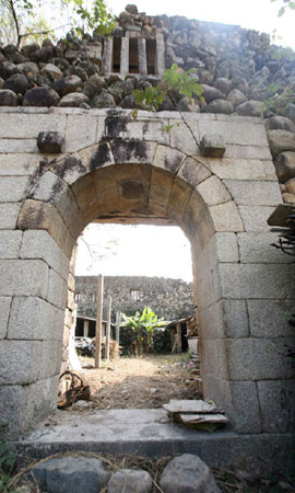 石堡是一個(gè)長(zhǎng)方形建筑,長(zhǎng)37米、寬31米,墻體內(nèi)外全是用鵝卵石及條石砌成,歷經(jīng)數(shù)百年風(fēng)雨,雖說已經(jīng)沒有了屋頂,只留下高約8米的墻基,但依然雄偉屹立。石堡的三面是護(hù)厝房,外墻也是石頭,但內(nèi)墻是由土夯成的,非常牢固,石堡大門上陰刻“懷珠”兩字。