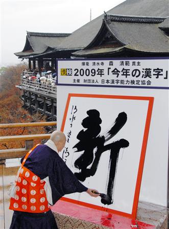 中新社東京十二月十一日電 日本十一日在京都著名古剎清水寺公布慣例的“今年的漢字”評選結(jié)果,“新”字當選為描繪二00九年的世象“代言人”。