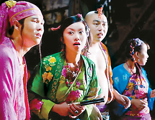 其一,全片表現(xiàn)以“鬧劇”式的敘事假定性(擬古而又將年代模糊化,中英語錯雜使用),劇中角色一個個俱成了從屬于“無厘頭化”情節(jié)進(jìn)程的符碼,遺去原版人物之“神”而僅存其形、其皮,全都平庸而了無新意。諸如張三、李四、王麻子再饒上兩個添油加醋的小小伙計(jì)趙六與陳七(毛毛扮演)。花上200萬美金買來的這個版權(quán),如此做法,不但堪稱極盡奢侈的浪費(fèi),同時也標(biāo)示了主創(chuàng)者創(chuàng)意能力的喪失而淪為匠藝般的“東施效顰”。