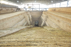 墓地占地面積約800平方米,通過一個(gè)39.5米的斜坡墓道,直接通到墓室門口,距離地面15米。如果有一座建筑的話,墓地就位于該建筑的地下五層。