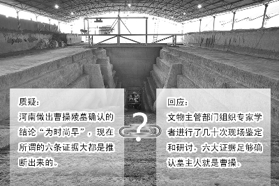 對于學者質(zhì)疑,河南省文物局副局長、新聞發(fā)言人孫英民進行了回應。他表示,曹操陵墓本身爭議很大,河南省文物局對于曹操陵墓的確認和發(fā)布非常慎重——從2009年10月開始發(fā)現(xiàn)有證據(jù)表明可能為曹操陵墓后,國家文物主管部門先后組織了歷史學、考古學、古文字學、人骨鑒定方面專家學者,進行了幾十次現(xiàn)場鑒定和研究討論,最后得出的結(jié)論是,目前掌握的六大證據(jù),足夠確認墓主人就是曹操。河南省文物局根據(jù)專家意見,報經(jīng)國家文物局同意之后,對外統(tǒng)一發(fā)布了曹操陵墓確認的消息,整個過程是嚴謹和慎重的。