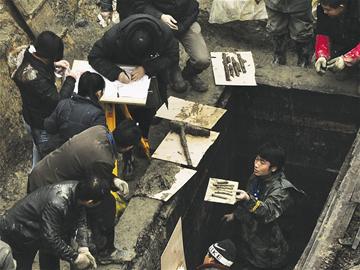 昨日上午10時許,工作人員從槨室內的淤泥中清理出幾片器物,吸引了眾人的目光。經(jīng)現(xiàn)場考古專家證實,這是兩枚珍貴的竹簡,由于年代久遠,墓室內的結構和環(huán)境又遭破壞,竹簡異常脆弱。工作人員隨即將竹簡嚴密包裹起來。由于槨室內的淤泥和積水較多,竹簡的數(shù)量和簡上文字內容尚不得而知。