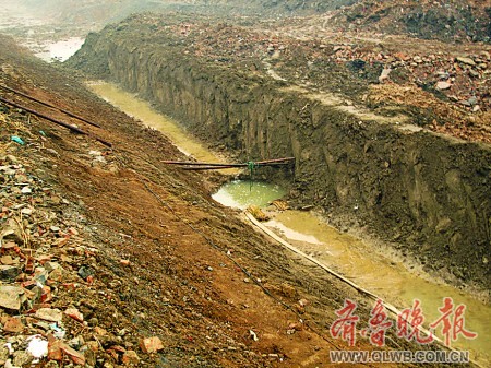 記者20日來到發(fā)現(xiàn)古墓的工地。因為下雨,工地中一片泥濘。這個剛被挖出的宋元古墓在一條東西走向的河溝溝底,距離地面約五六米,墓口用兩根棍子示意。起初,墓穴的外形還比較明顯,隨著河溝一側(cè)的雨水向墓穴匯去,幾十分鐘的工夫便被淹沒了。