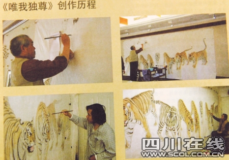 一個(gè)小時(shí)之后,事情出現(xiàn)了非常戲劇性的變化。不少關(guān)于《惟我獨(dú)尊》的照片和畫冊在同城某大廈的會議室里出現(xiàn),這里正召開一場關(guān)于“打虎”的新聞發(fā)布會,發(fā)布會的發(fā)起人尹青,是畫家孟祥順的好朋友,也是一名成都的律師,這次他是以孟祥順特別代理人的身份緊急約見成都媒體。尹律師義憤填膺地說:“現(xiàn)在正在長江畫院展覽的《惟我獨(dú)尊》是百分之百的假貨,