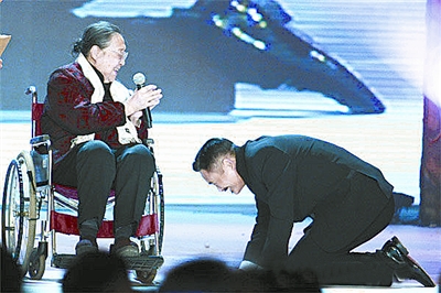 被譽(yù)為2010中國(guó)第一史詩(shī)巨片的《孔子》,1月中旬在北京舉行首映慶典,慶典上孔子的第77代嫡孫女孔德懋女士坐著輪椅上臺(tái),周潤(rùn)發(fā)便一直在旁邊像子侄一樣跪著聽(tīng)老太太講話?椎马渴①澲軡(rùn)發(fā)在電影《孔子》中飾演孔子的精彩表演,并將寫有“永遠(yuǎn)的孔子”的橫幅贈(zèng)送給發(fā)哥。這時(shí),周潤(rùn)發(fā)出人意料地向孔女士認(rèn)真雙膝跪地叩首,隨后,與孔女士溫情擁抱,場(chǎng)面令人動(dòng)容……