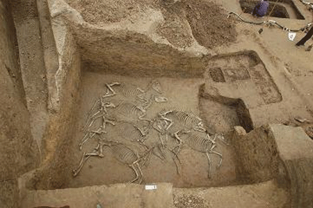 墓室上口長6.2米、寬5米。墓道長15.7米。兩座墓均為南北向,人骨均已散亂,器物箱內(nèi)都放置鼎、簋、盤、匜、矛等青銅器、車馬器和陶鬲;墓道內(nèi)均隨葬兩輛馬車和一只狗。墓葬出土玉器10余件,青銅器50余件,其中8件有銘文。在大墓與祭壇之間發(fā)現(xiàn)5座馬坑和1座車馬坑。馬坑僅有馬骨架,其中一座殉馬2匹;兩座殉馬各8匹,分兩排整齊擺放;兩座殉馬各6匹,其一分兩排擺放,前2后4,另一座為兩兩成對放置,頭向不一,中間放置一件牛角。車馬坑長14米,寬3.4米。內(nèi)置3輛車,前兩輛皆四駕,后一輛兩駕。馬頭上均有精美的青銅和串貝飾件。因天氣和水位過高,現(xiàn)正在對車馬坑進(jìn)行整體提取,移至室內(nèi)清理。