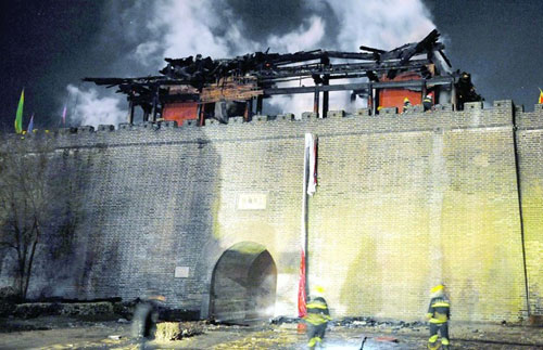 昨日,記者從正定縣文物旅游局獲悉,目前正定南城門上仿古建筑燒毀嚴(yán)重,游客暫不能登城游覽。城門上啟功書(shū)寫(xiě)的“長(zhǎng)樂(lè)門”三字匾額已被燒毀。古城磚墻部分并無(wú)大礙,上書(shū)“三關(guān)雄鎮(zhèn)”字跡仍在。目前,正定縣已將南城門列入計(jì)劃準(zhǔn)備馬上重修。