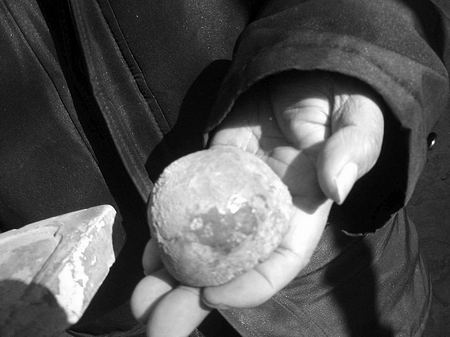 記者在龍振山處不但見到大如饅頭的“門釘”,而且還看到他在西高穴收集的大如簸箕的瓦片,長(zhǎng)與下寬足有50多厘米,龍振山持于身前,遮蓋了半個(gè)身子。