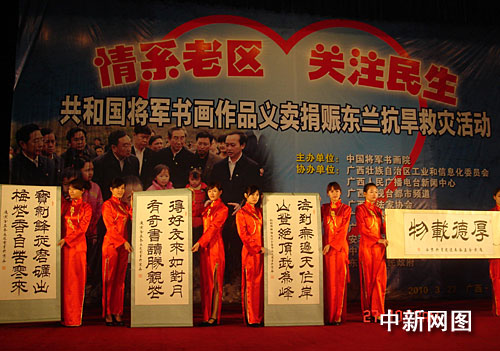 中新網(wǎng)南寧3月27日電(記者 羅先彬)2009年8月份以來,廣西革命老區(qū)東蘭縣境內(nèi)持續(xù)干旱,人畜飲水困難,農(nóng)業(yè)生產(chǎn)受影響嚴重。東蘭縣嚴重的旱情,牽動了一群遠在北京的共和國老將軍的心:中共第十二屆至第十五屆中央委員、原沈陽軍區(qū)、蘭州軍區(qū)司令員、軍事科學院院長劉精松上將,和其他八位老將軍,不顧年高體弱,千里迢迢趕赴南寧,獻出自己精心創(chuàng)作的114幅書畫作品進行慈善義賣,所得114萬元全部捐給東蘭人民,用于目前的抗旱救災。