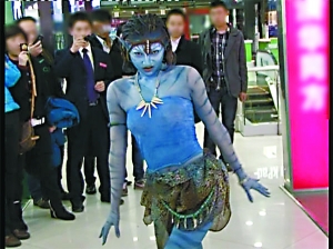 擁擠的中關(guān)村電子賣場,一位舞者化身成電影《阿凡達(dá)》里的納美人,伴隨著《大河之舞》的音樂正大跳踢踏舞,藍(lán)色的腳尖踩踏的不是地板,而是9臺筆記本……這段被市民拍下的視頻在網(wǎng)絡(luò)上瘋傳,網(wǎng)友評價其為“史上最具幻想力的商家宣傳”。
