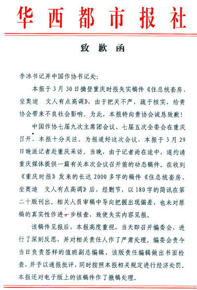 報道此事的《華西都市報》也向中國作協(xié)發(fā)出了致歉函。致歉函稱:本報于3月30日摘登重慶某媒體失實稿件,把關不嚴,疏于核實,給貴協(xié)會帶來不良社會影響。為此,本報特向貴協(xié)會誠懇致歉。