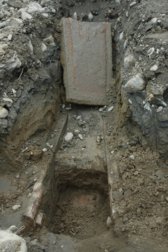 近日,四川省江油發(fā)電廠在維修老廠區(qū)染料車間道路時發(fā)現(xiàn)古墓,廠方立即停工保護(hù)現(xiàn)場并報(bào)告市文管所前來調(diào)查。該墓葬為唐代石槨墓葬。墓長2.45米,寬1.2米高0.9米,墓葬距地表1.1米。清理出土有開元通寶錢幣、鐵器殘件、瓷片、陶片殘件等文物標(biāo)本。